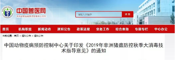 2019年10月22日,中國(guó)動(dòng)物疫病預(yù)防控制中心為做好全國(guó)秋季“大清洗、大消毒”專項(xiàng)行動(dòng),起草了《2019年非洲豬瘟防控秋季大消毒技術(shù)指導(dǎo)意見》,指導(dǎo)養(yǎng)殖企業(yè)的秋季消毒工作。
